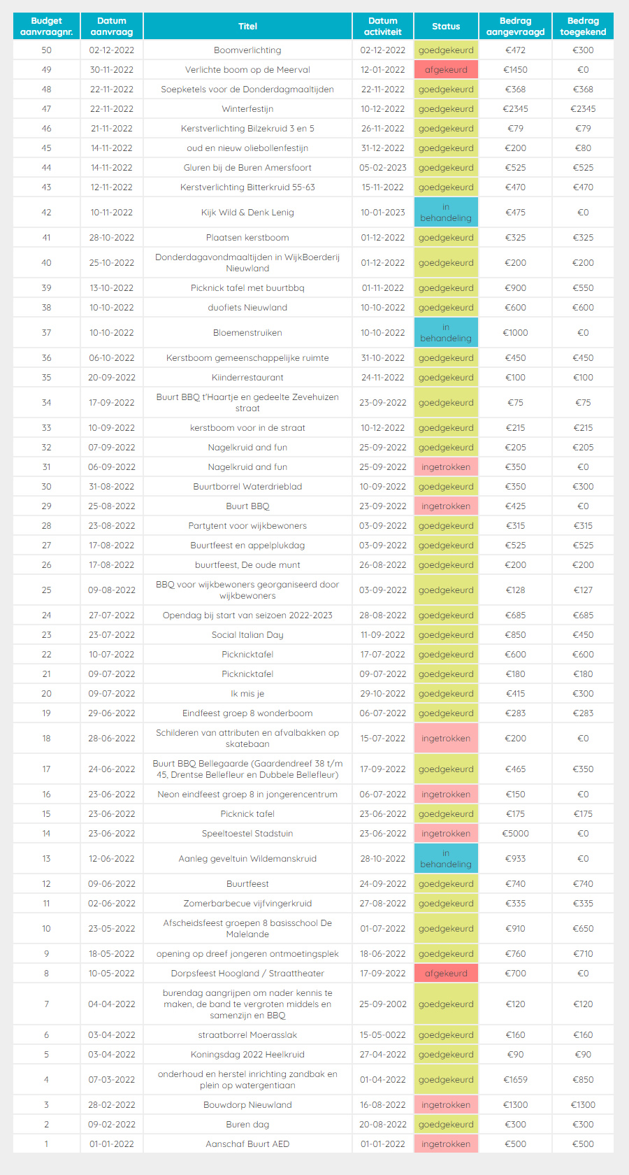 Onderstaand is een screenshot van de aanvragen tot en met 31 december 2022