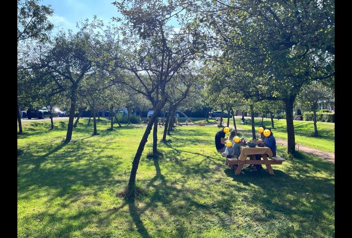 Dankzij deze mooie picknicktafel kunnen wij nu nóg meer genieten van deze geweldige boomgaard. De kinderen spelen, de ouders komen samen voor een kopje koffie in de schaduw onder de appelbomen: beter kan niet. Zoals op de foto te zien kan de tafel op mooie dagen gebruikt worden om met meerdere gezinnen aan te eten, ideaal! En dat allemaal dankzij het buurtbudget, bedankt!
