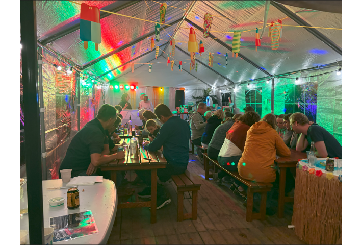 ’s Avonds stond de disco bingo centraal: een prijzenparade waarbij luid werd meegezongen. Daarna was de karaoke een groot succes – een echte publieksfavoriet. Het feest werd afgesloten met een sfeervolle kampvuursessie, waarmee de dag in warmte en gezelligheid eindigde.